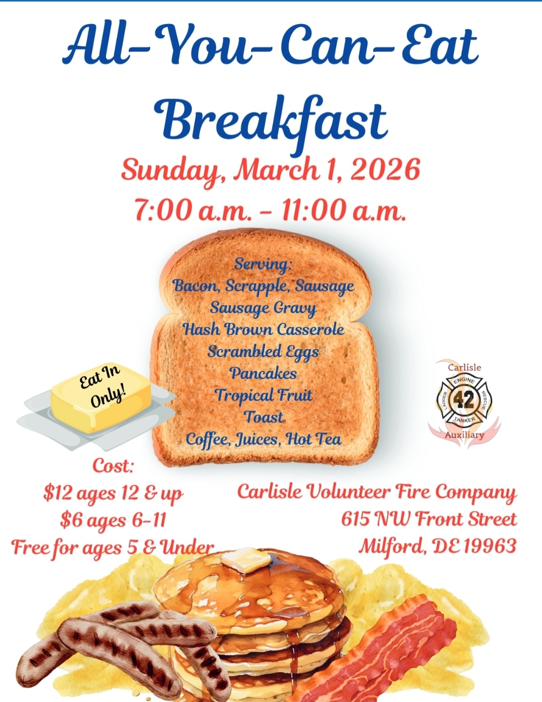 Mark your calendars and come enjoy breakfast with us on Sunday, March 1, 2026, from 7:00–11:00 AM.
